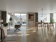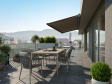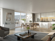 - Vier grosszügige Eigentumswohnungen mit 3 ½- bzw. 4 ½ Zimmern mit ca. 115 m² Wohnfläche und Terrassen mit zwischen 45 m² und 58 m²